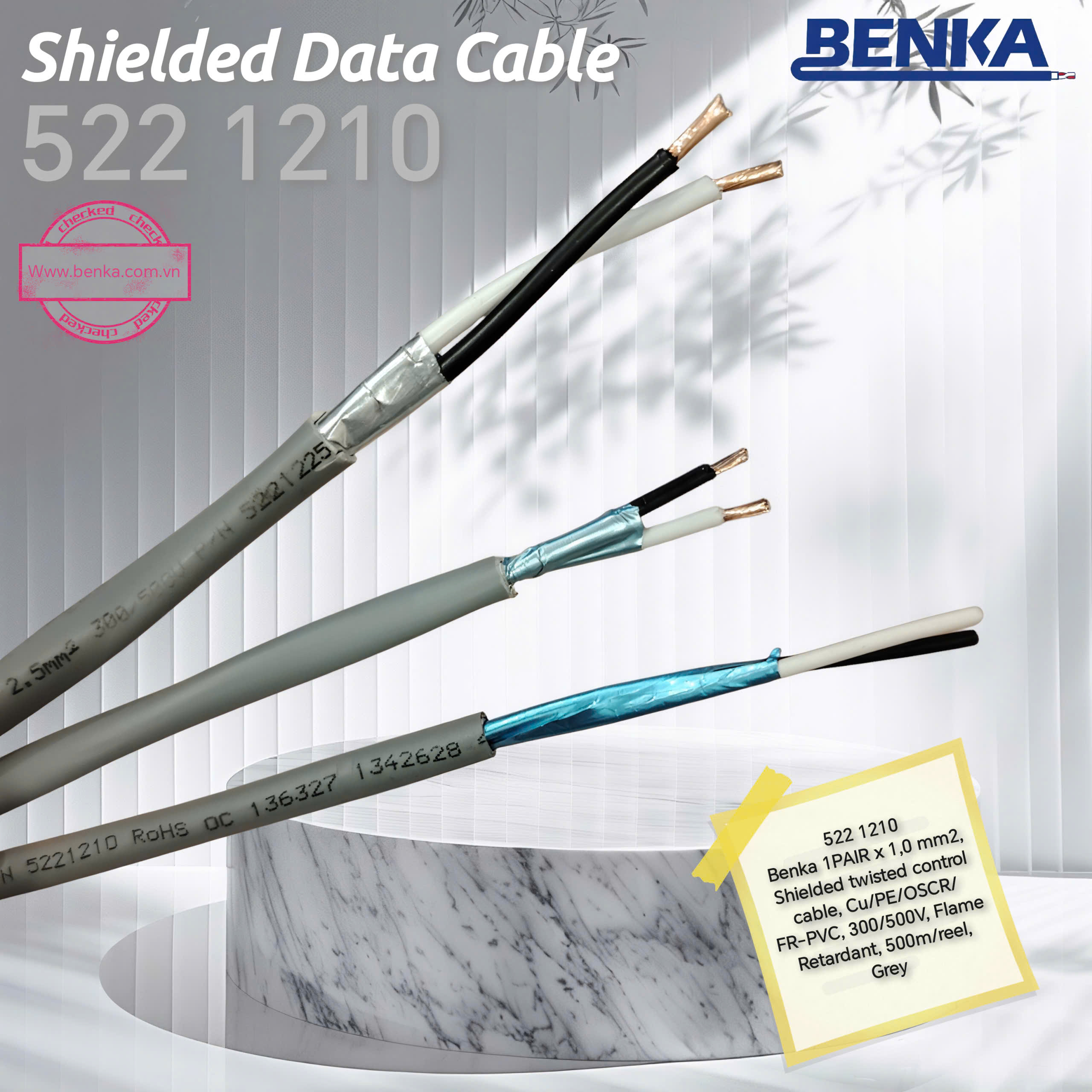 Dây cáp điện và điều khiển tín hiệu vặn xoắn chống nhiễu BENKA 522 1210 được sử dụng dây dẫn bằng Đồng trần mềm, bện nhiều sợi, cấp mềm CLASS 5, Size: 1Pair x 1.0mm2, Cách điện (Insulation): Polyethylene (PE), 2 lõi xoắn thành 1 cặp (1 Pair) với hai màu đen + trắng, Lớp chống nhiễu / màn chắn (Overall screen): Băng nhôm (Aluminium foil) bao phủ 100%, Vỏ ngoài (Outer sheath): FR-PVC Màu Xám. chắc chắn, có thể chống chịu tốt các tác nhân từ ngoài môi trường, thích hợp với mọi môi trường trong nhà, cáp cho dự án công trình nhà máy và tòa nhà.